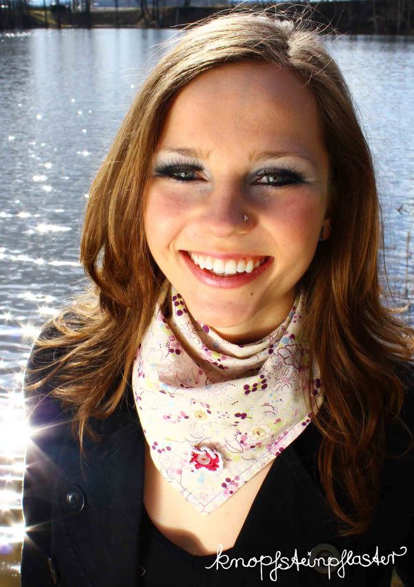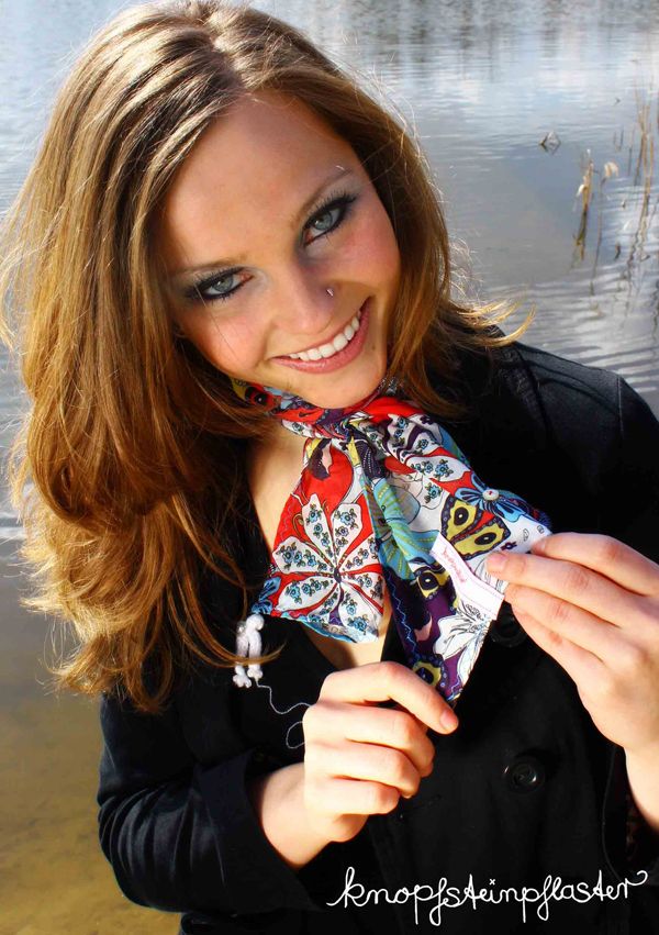 Jedes unserer Tücher ist mit einer farbig passenden Naht versäumt. Natürlich dürfen auch unsere Markenzeichen, die Knöpfe, nicht fehlen. Dazu ein selbstgemachtes Accessoires, und fertig ist ein schöner Halsschmuck, der den Herbstwind fern hält.